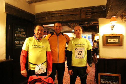 So, arm Skins went on and Gore Windstopper came off as I attempted to get some serious arm swinging in the stage from CP5 to the finish, just 6 miles away. Just an orange glow of sodium street lamps and the warm feeling of iminent success bathed my vision ahead. Cat and mouse with 3 guys and a chat about a marathon in the Falklands and all of a sudden I hear a chap shout that the finish is around the corner.....it was my brilliant running buddy George who had come to suprise me at the finish, along with his wife Astrid. Unbeknown to me, they had been on the phone to Mrs UltraBobban and had come to see me. Great.